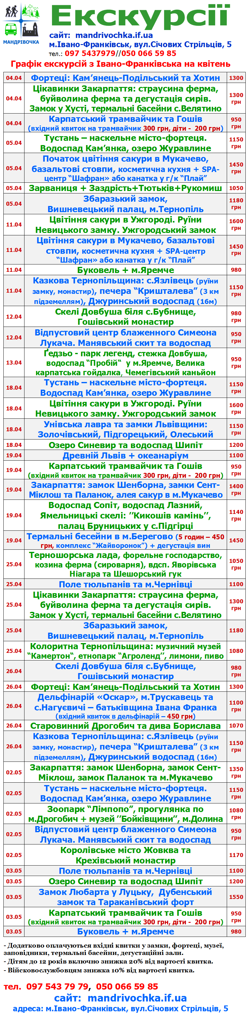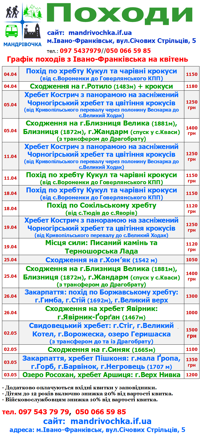 Графік екскурсій та походів з Івано-Франківська на квітень 2026р